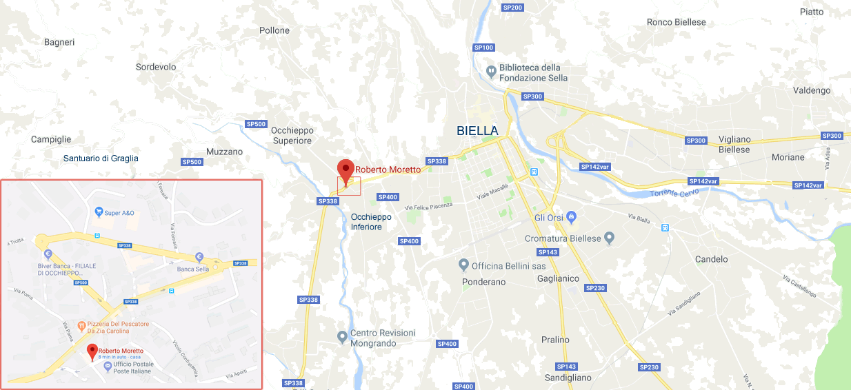 Siamo di fronte all’Ufficio Postale di Occhieppo Inf. Provenendo da Biella, 250 metri prima del ponte sull’Elvo svoltare a sinistra nel senso unico via Cavour, dopo 20 metri si arriva nella piazza delle poste, in via Rossini.